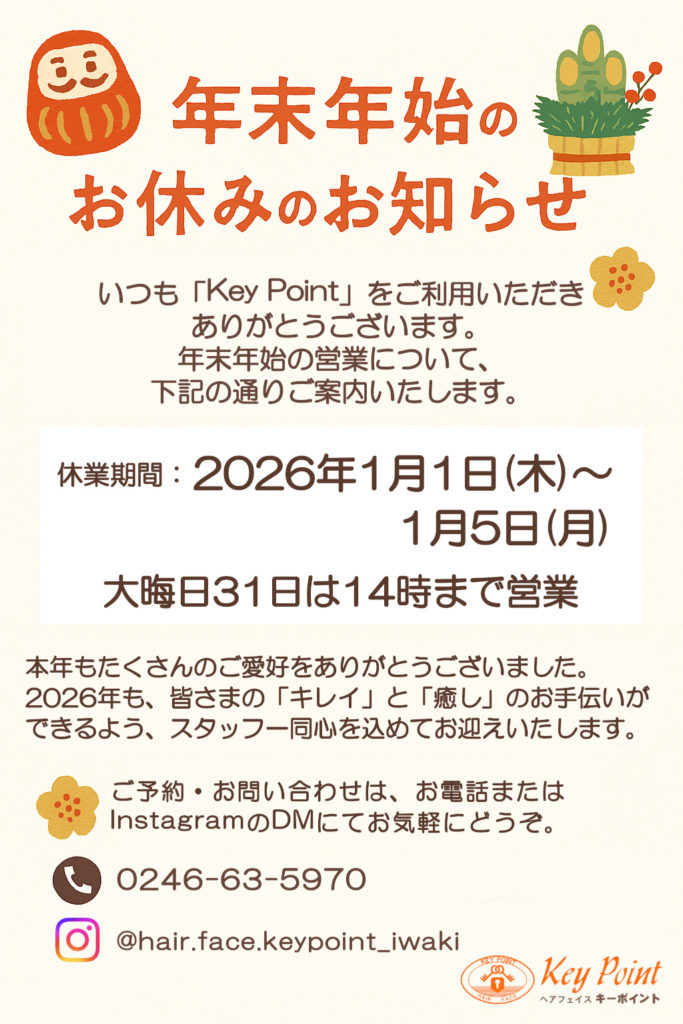 今年も一年間、ヘアーフェイス キーポイントをご愛好くださいまして、誠にありがとうございました。