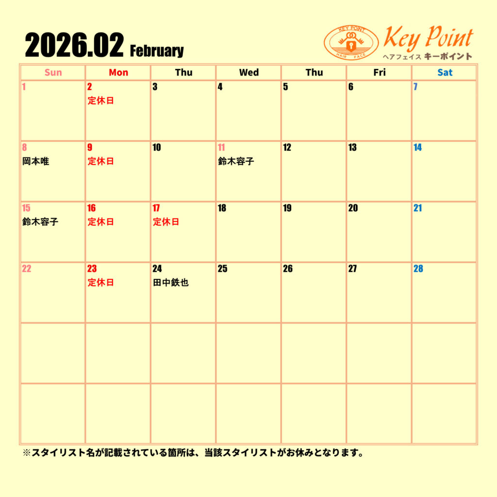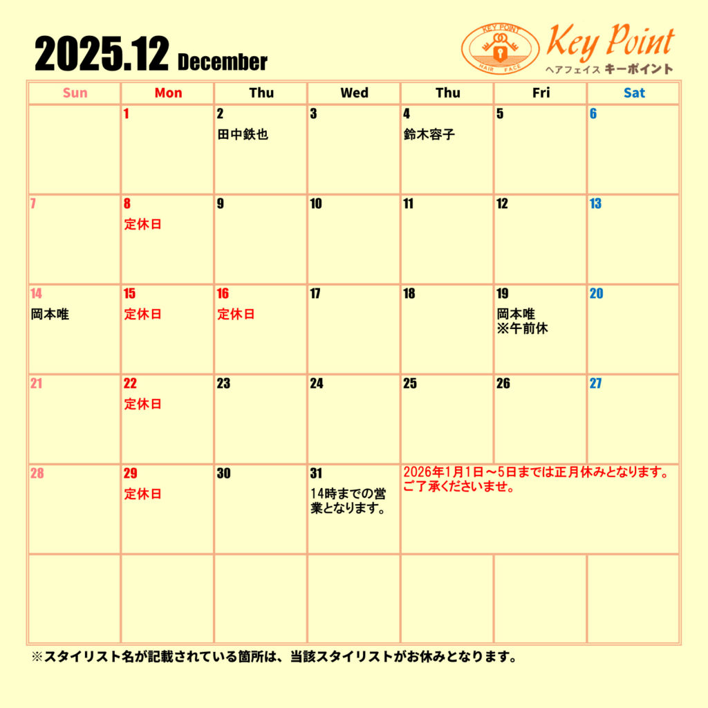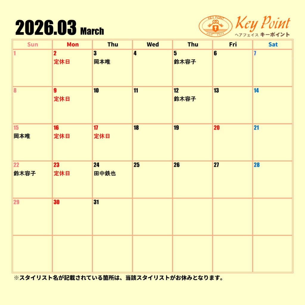 STAFF オーナー田中鉄也美容歴:18年 得意スタイルショートスタイルメンズパーマ全般 スタイリスト鈴木容子美容歴:17年 得意スタイルへアアレンジナチュラルロングミディアム スタイリスト岡本 唯美容歴:7年 得意スタイルショートスタイルメンズカット アシスタント志賀 舞 美容歴:7年 アシスタント鈴木勇作 営業日やスタイリストのお休みはカレンダーの画像をタップもしくはクリックすると拡大してご覧いただけます。